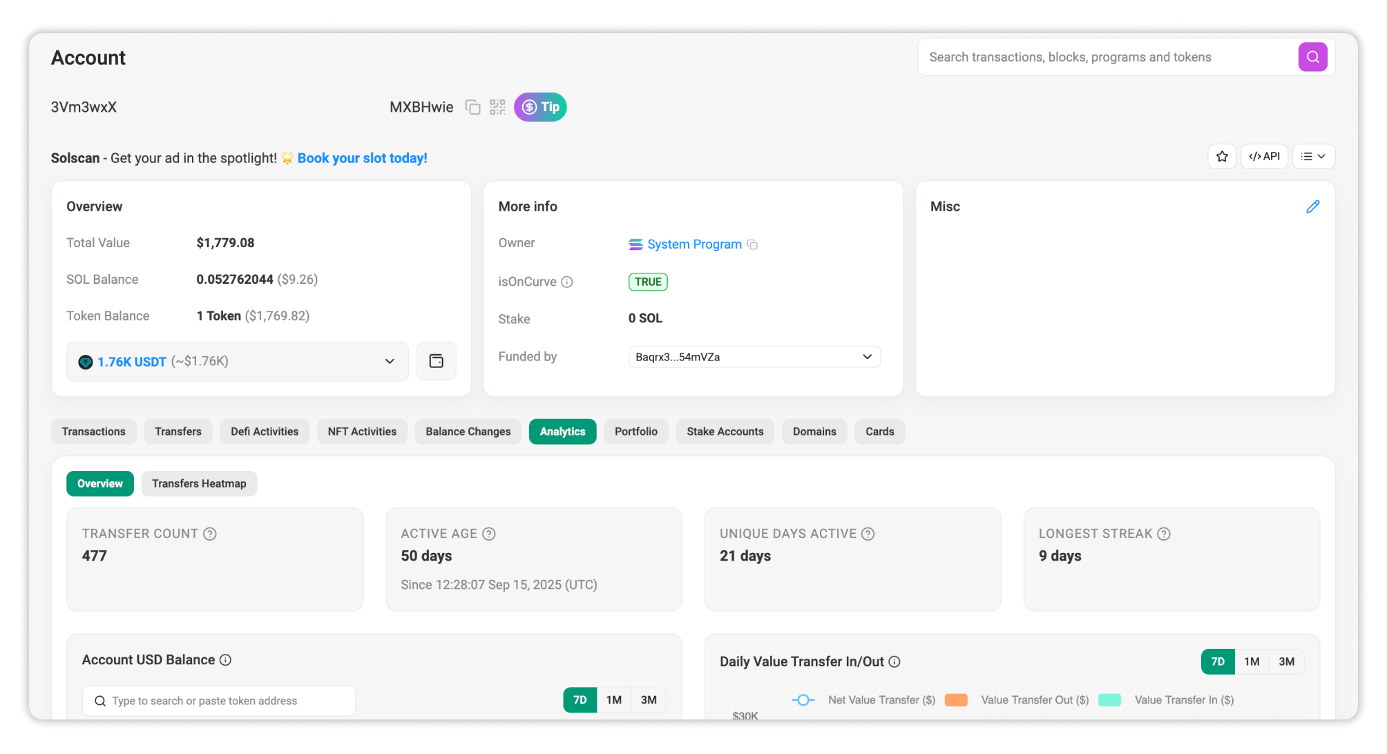 Account Analytics provides a comprehensive view of a wallet’s on-chain activity and balance patterns over time. Designed for users who want to go beyond raw transaction data, it offers an intuitive way to visualize transfer behavior, balance trends, and activity frequency.