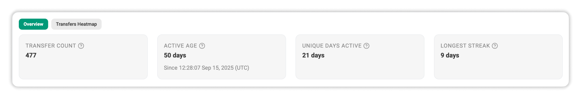 - Transfer Count: The total number of transfers involving the address as a sender or receiver.