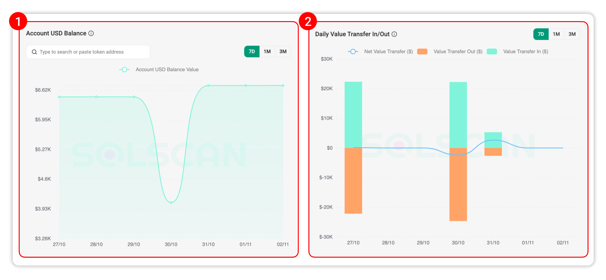 - Daily Value Transfer In/Out: This chart visualizes total daily value transferred in and out of the wallet.