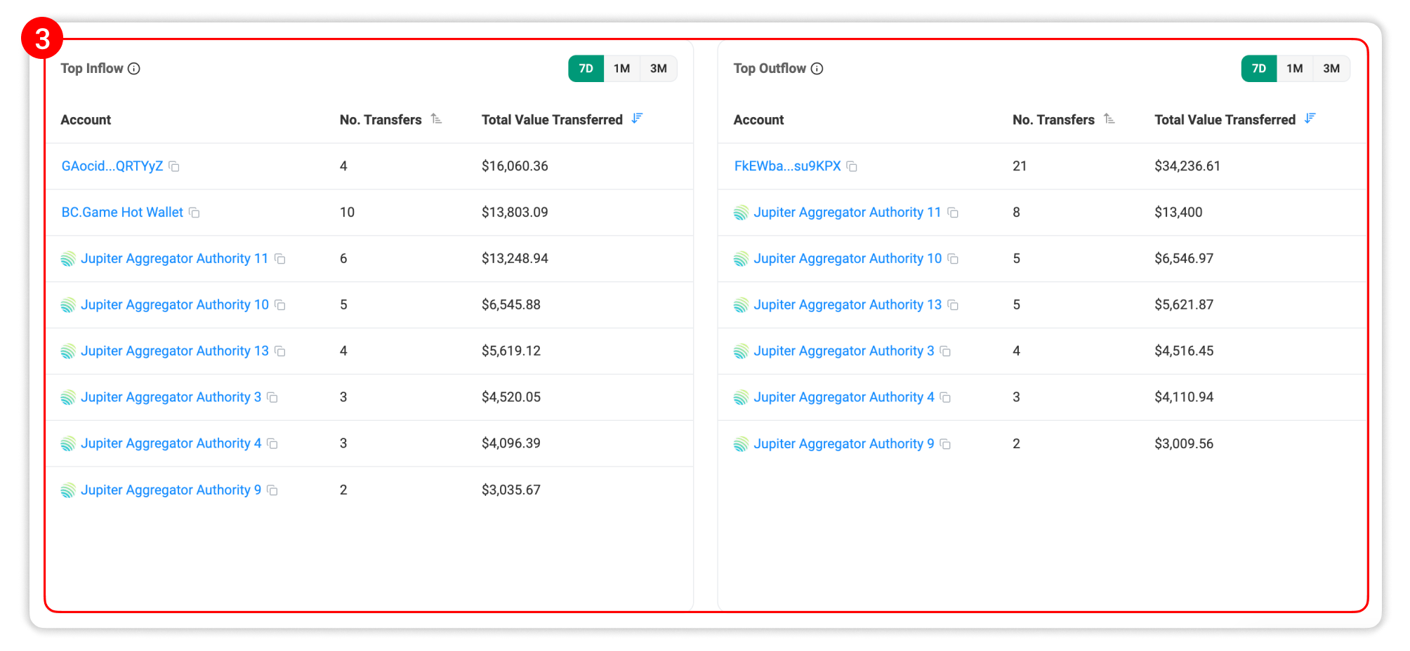 - Top Inflow/Outflow: These tables list the top addresses the wallet has interacted with, ranked by the highest transfer value that the wallet has received from (inflow) or sent to (outflow).