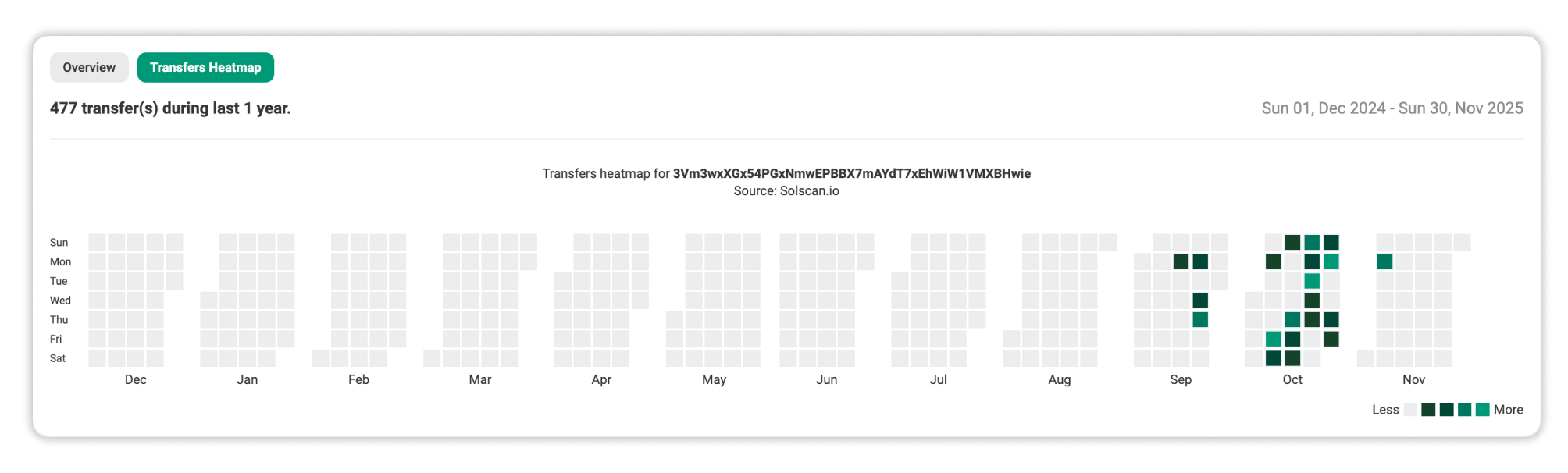 The Transfer Heatmap offers a calendar-style view of your wallet’s transfer activity across each month, inspired by the GitHub contributions chart.