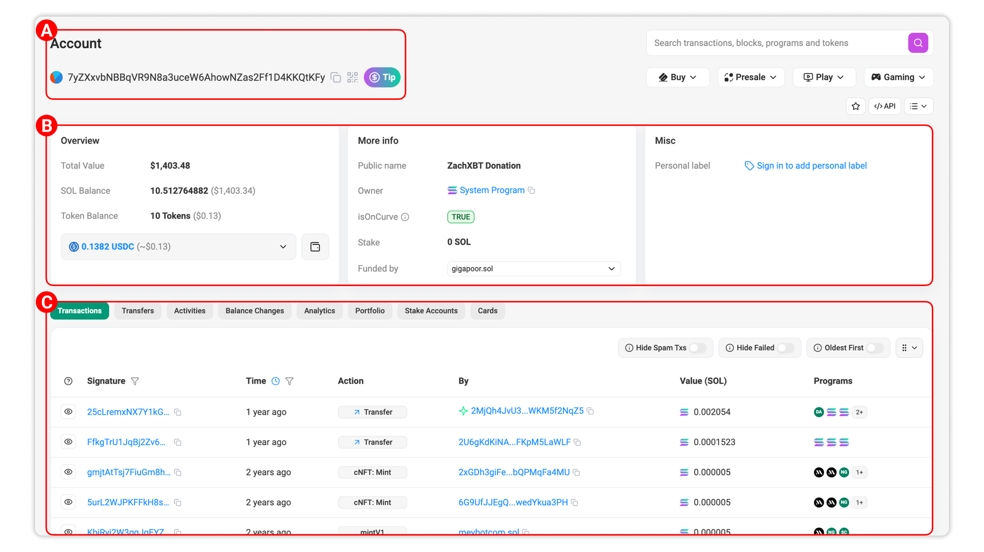 User can look into any Account (i.e. wallet address) page on Solscan by pasting a wallet address in the search bar on every page of our website. An Account page is as below. To understand this page, we will break down and go through it in three sections: (A) General information, (B) Account details and (C) Activity.