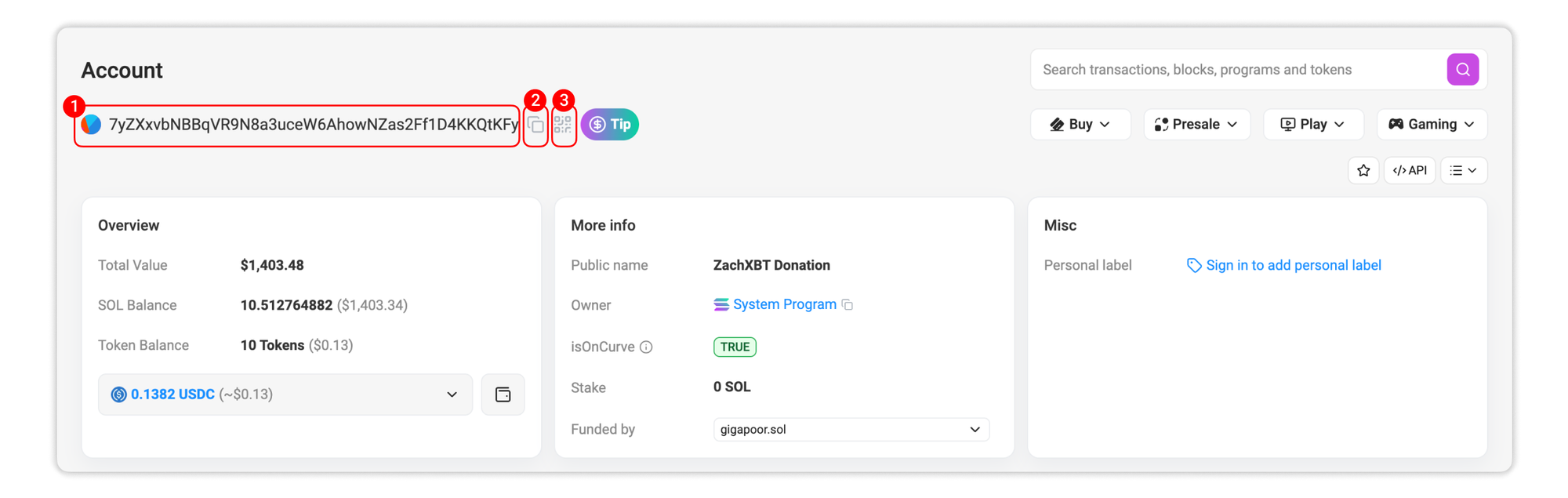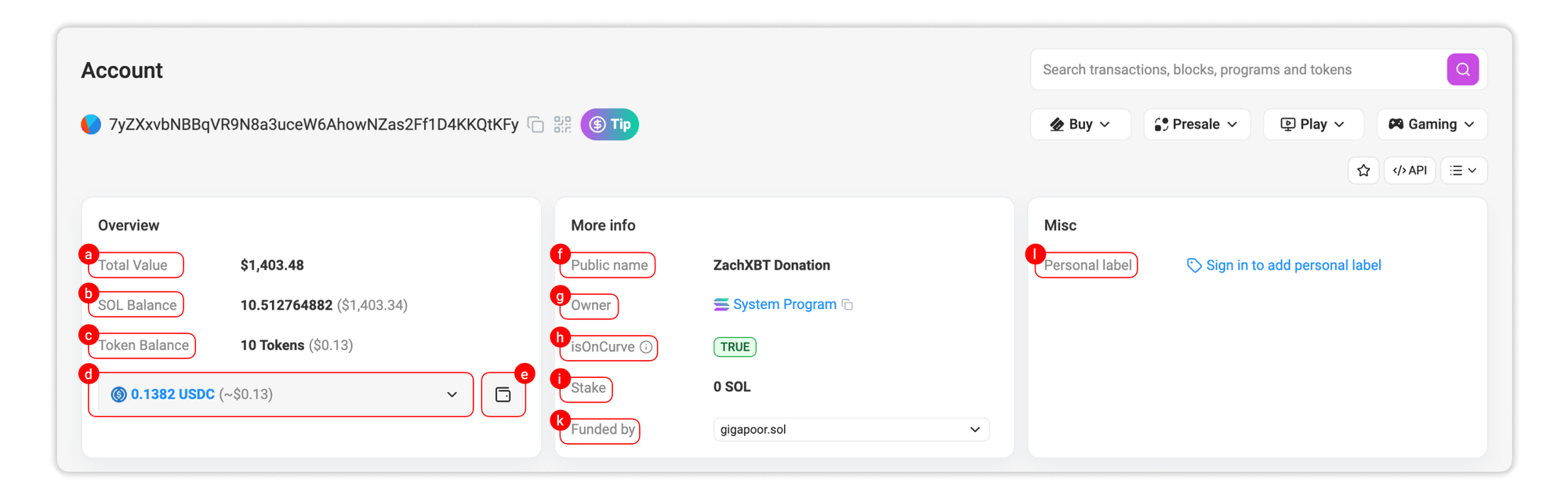 f. Public name: If this address belongs to a specific entities on Solana and is labelled by Solscan team, it will be shown here.
