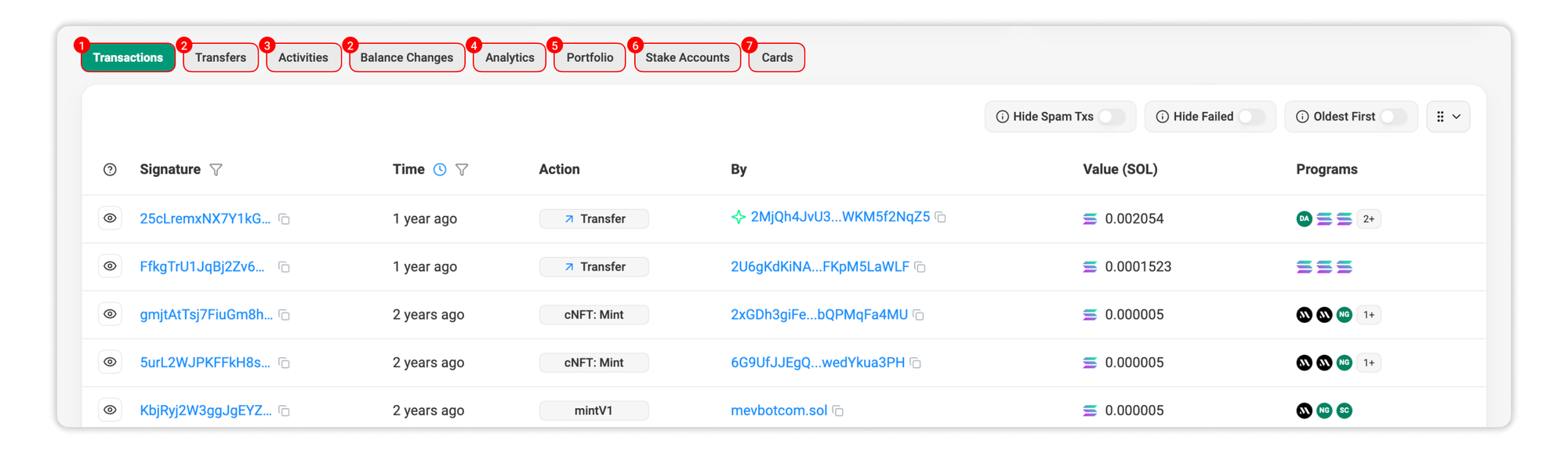 Balance Changes: This tab displays all SOL and SPL transfer activities of the wallet.