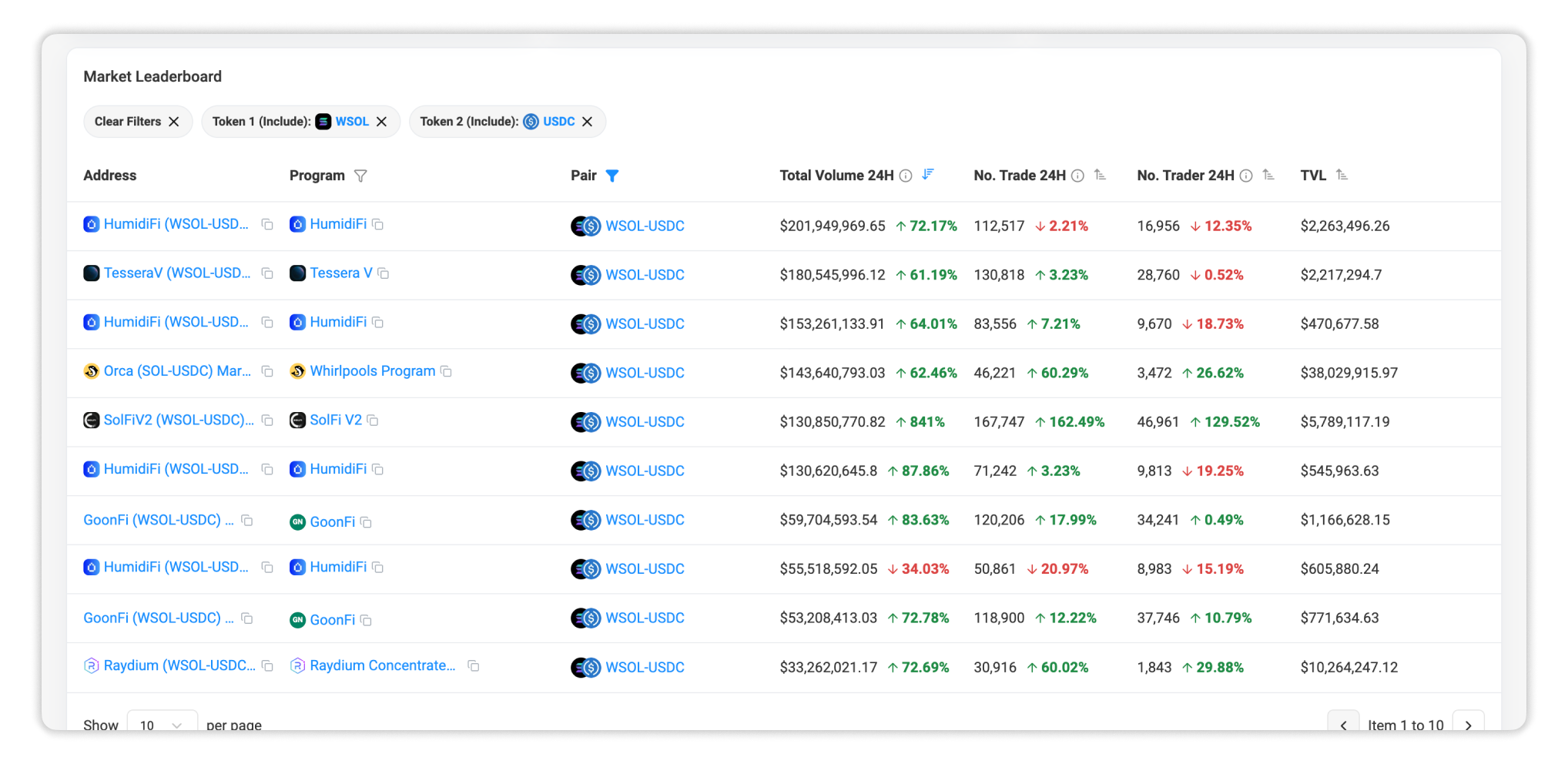- Filter the leaderboard using the Pair column to pick out only SOL/USDC markets.