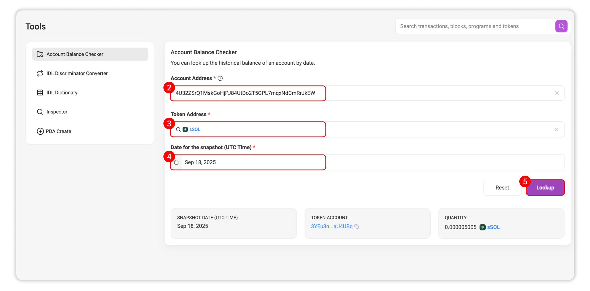 The Account Balance Checker determines the balance of any SPL token for a given wallet at a precise point in time. It evaluates all relevant token activity—mints, burns, transfers, staking-related movements—and returns the exact end-of-day balance for the selected date.