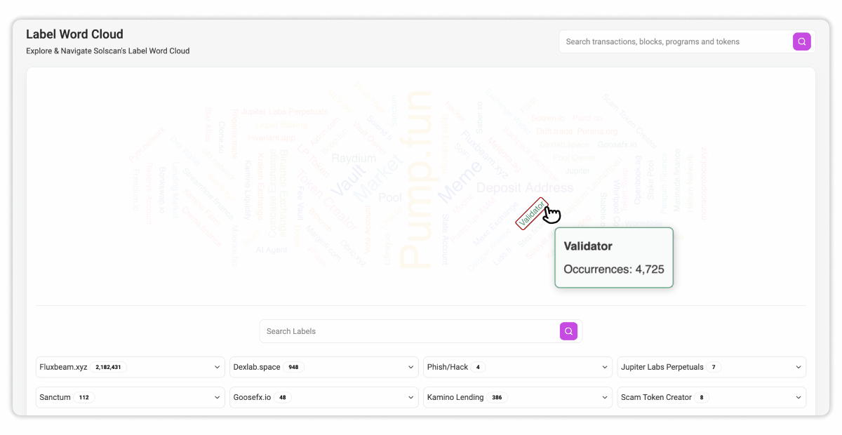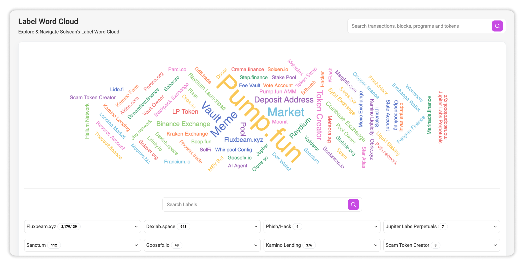 The Label Word Cloud provides an aggregated view of all tags on Solscan. Each label is interactive; clicking on one brings users directly to that tag’s detail page, where the top 100 most relevant or active addresses are displayed. This ensures that each tag page remains useful, focused, and easy to navigate.