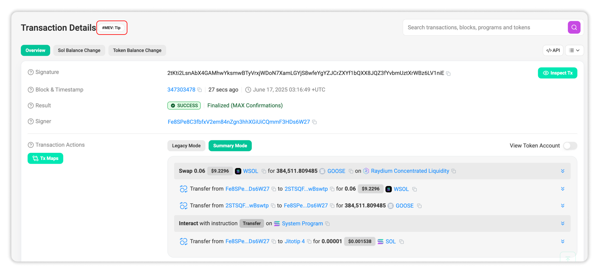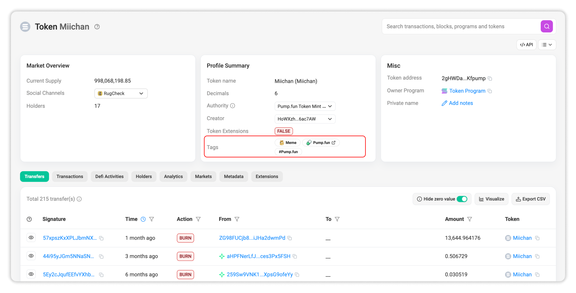Tags on Solscan provide contextual labels for a wallet address, a token, or a transaction page. They usually appear directly on token and account detail pages, as well as at the top of transaction detail pages, helping users quickly understand what they are looking at.