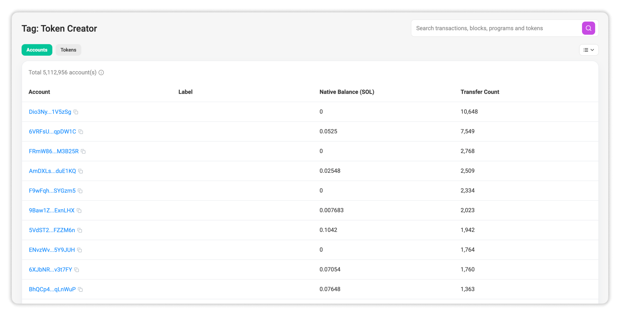 Clicking on a tag from any account or token page directs users to a dedicated tag archive page, where other addresses or tokens sharing the same label are listed. For example, selecting the 'Token Creator' tag allows users to explore a list of the top 100 addresses that have each deployed at least one token on Solana. This structure supports faster behavioral analysis and provides a starting point for further investigation.
