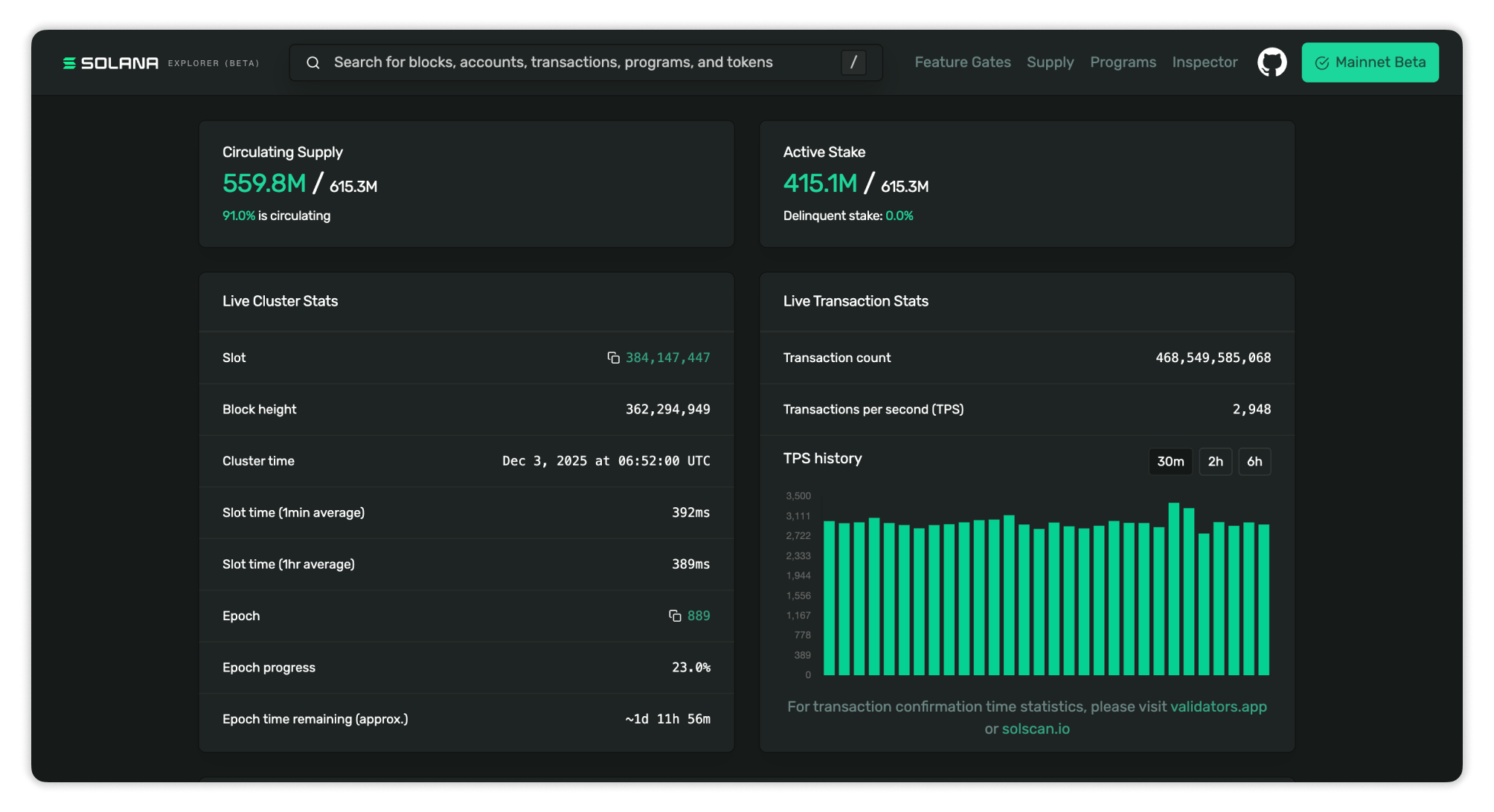 - Network and validator visibility such as real-time TPS, block performance, priority fees, stake distribution, validator uptime, and commission data